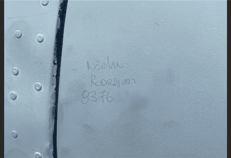 El nombre y el número de teléfono lo escribieron en el fuselaje de un avión pequeño, modelo Y12E, parte de una donación que hizo la República Popular China en 2016.