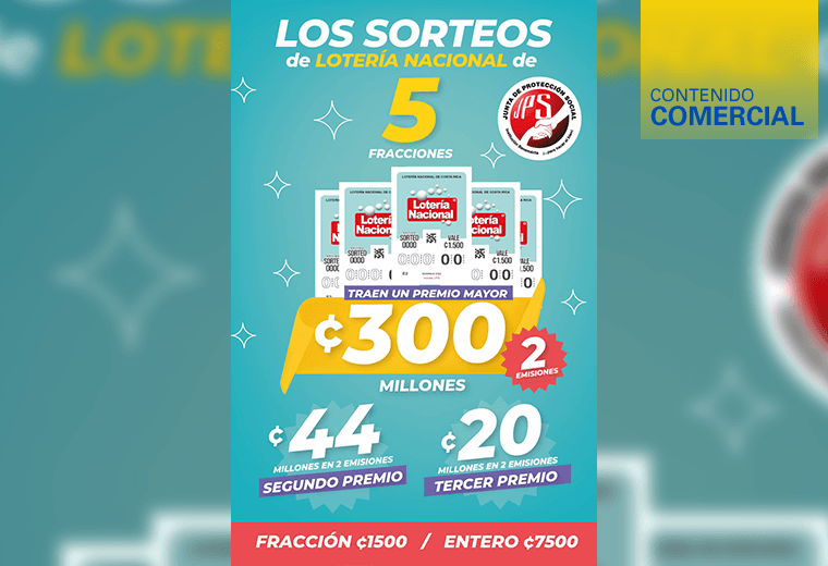 Los sorteos de 5 fracciones de Lotería Nacional de la Junta de Protección Social (JPS) traen un premio mayor de ¢ 300 millones en dos emisiones, un segundo premio de ¢44 millones en dos emisiones y un tercer premio de ¢20 millones en dos emisiones.