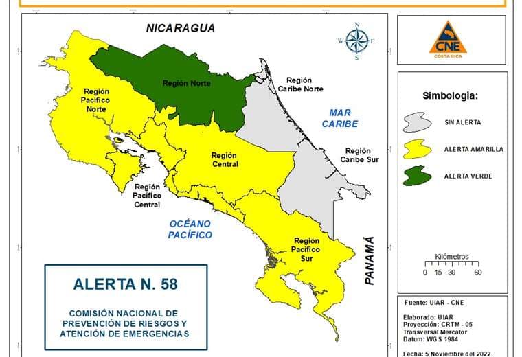 La Comisión Nacional de Emergencias (CNE) comunicó el cambio de alertas este sábado, aunque no se reportan incidentes hasta ahora. En el caso de la Zona Norte, se mantiene en color verde.
