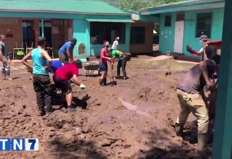 En el sector de La Isabel, vecinos acudieron a la escuela Dr. Valeriano Fernández, institución que fue golpeada por el temporal. Ahí están limpiando las instalaciones porque todo el centro educativo recibió los embates del río.