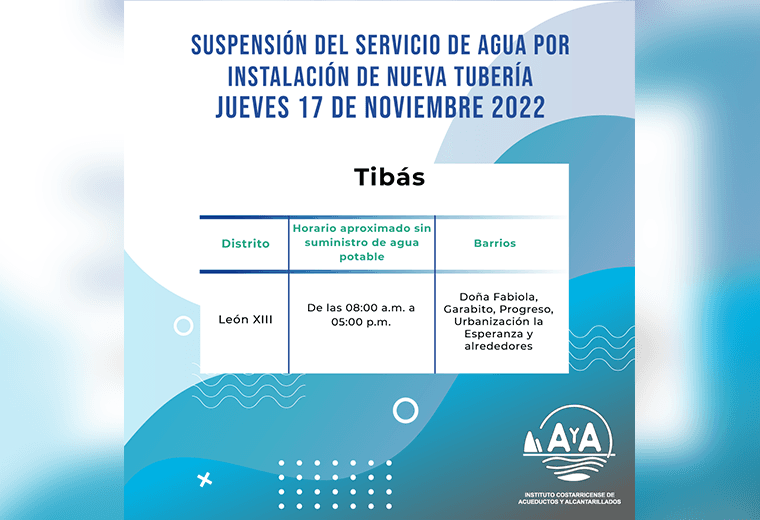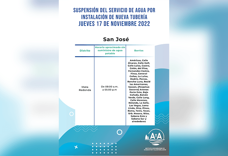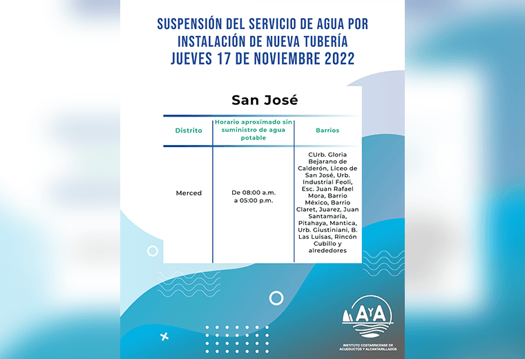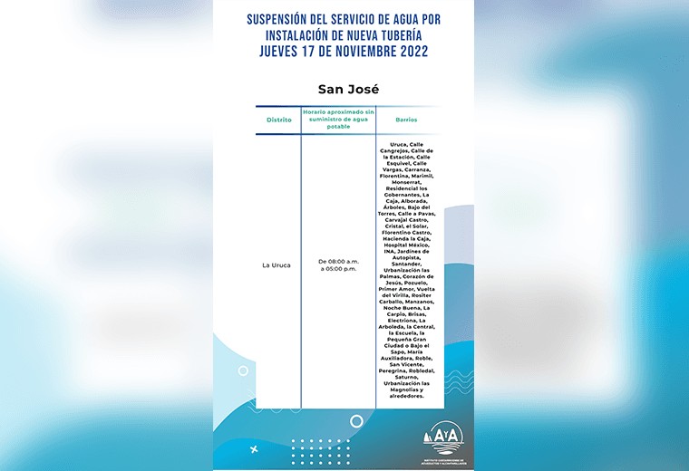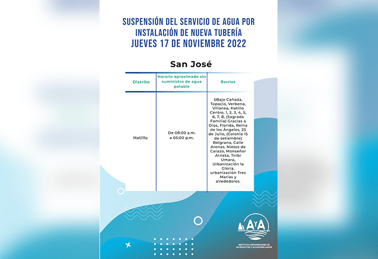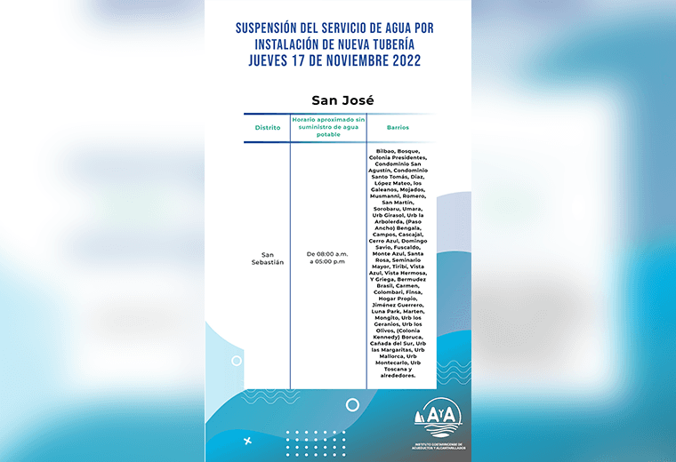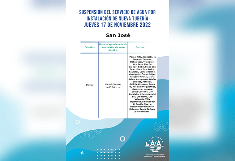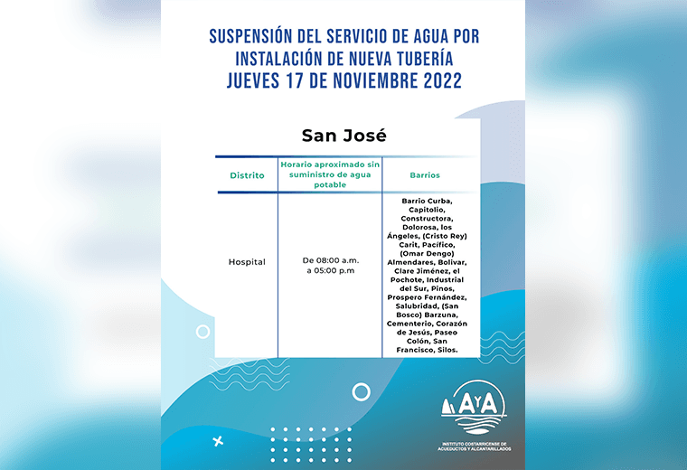 “Para los trabajos que se realizarán este jueves 17 de noviembre será necesario suspender el servicio de agua en estos lugares mientras se realizan las labores; sin embargo, posteriormente, representará una mejora sustancial en el servicio continuo de agua potable”, mencionó Roy González ingeniero de Control y Operación de AyA.