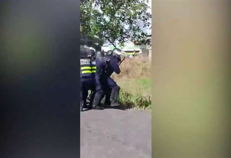 En varios videos se observa como apenas un puñado de oficiales con traje de antimotines hizo frente a decenas de personas que tenían el cierre de la ruta principal.