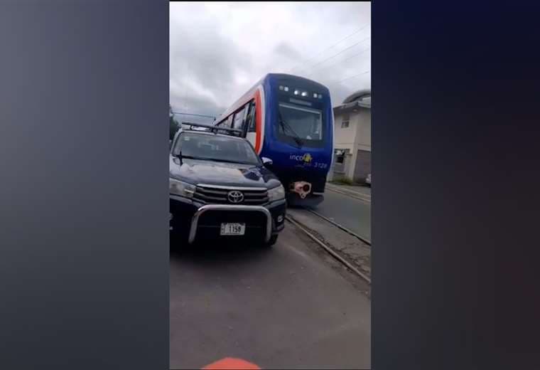 El tren debía cruzar, pero el vehículo y unas barreras plásticas estaban obstruyendo su paso.