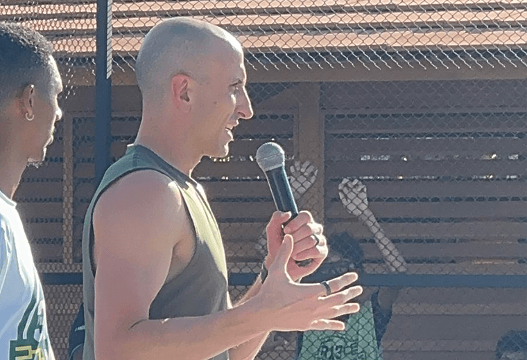 Ginobili dio un par de clínicas a los chicos, luego hizo el tiro inicial del centro y que dio cara al campeonato relámpago 3X3 entre colegios de la localidad llamado “3x3 Madness 2025″.