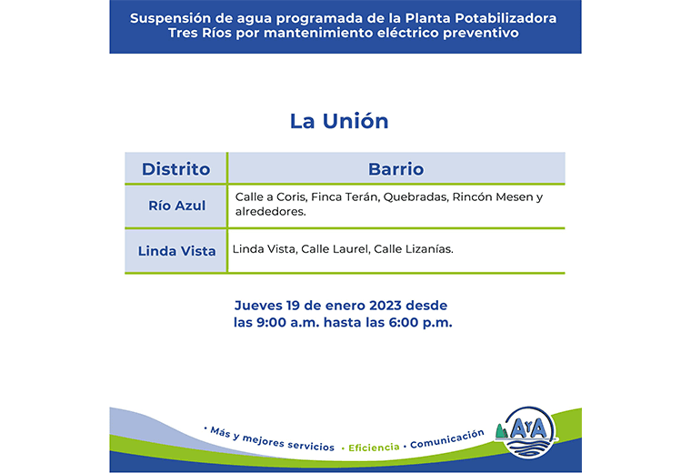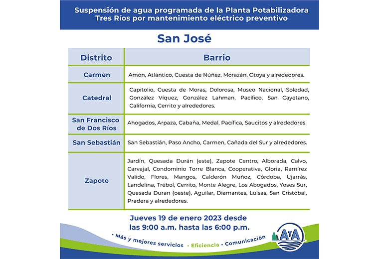 Cuatro cantones de San José y uno de Cartago estarán sin agua este jueves