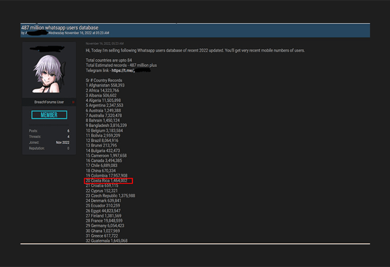 Según la publicación, la filtración incluye 1.4 millones de números de WhatsApp costarricenses.