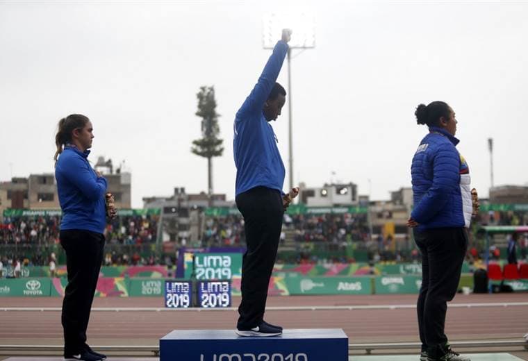 En el podio durante la ceremonia de premiación el viernes, Race Imboden se arrodilló tras colgarse el bronce en florete individual de esgrima. El sábado en el estadio de atletismo de La Videna, Gwen Berry alzó su puño derecho desnudo tras ganar el oro en lanzamiento de martillo.