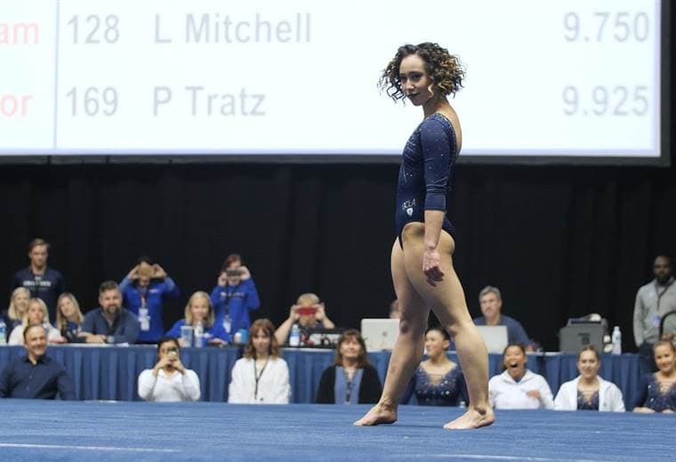 La gimnasta estadounidense deslumbró durante el ejercicio de suelo en un desafío universitario en Florida para darle el triunfo a su equipo convirtiéndose en una de las mayores sensaciones de la gimnasia amateur