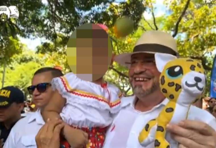 El mandatario tenía a una niña alzada en brazos cuando, de repente, un mango cayó sobre él, golpeándolo en la cabeza y luego en el pecho, dejando una mancha en su camisa.