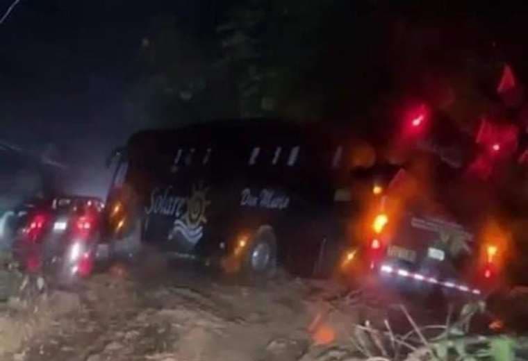 El bus se quedó atrapado en el barro y no quedó más que remolcarlo entre todos.