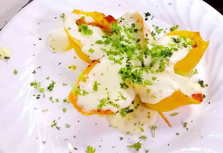 Cocinar las conchas en agua y sal, enfriar. Cristalizar la cebolla y chile dulce en la mantequilla. Revolver los quesos con la leche evaporada. Escurrir el atún con vegetales y revolver todos los demás ingredientes, probar la sal y rellenar las conchas. Disponer en un refractario engrasado. Hornear por 15 min, solo para calentar bien el relleno. Servir las conchas bañadas con la salsa de eneldo.