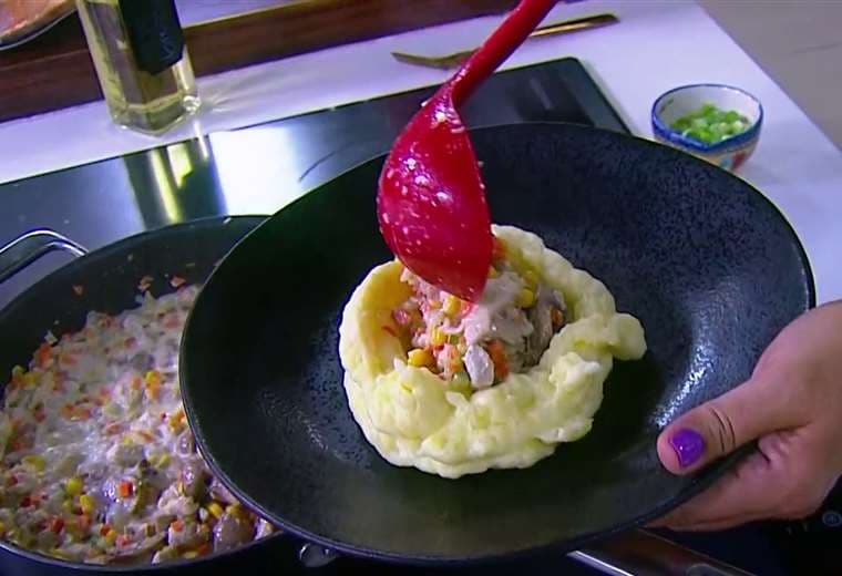 Con ingredientes sencillos, esta receta combina la suavidad del puré con un delicioso relleno de pollo en salsa.