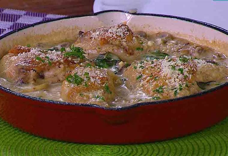 Agregar la crema dulce, el caldo de pollo y el queso. Devolver las piezas de pollo a la sartén y llevar al horno por 20 minutos aproximadamente hasta que el pollo se cocine bien.