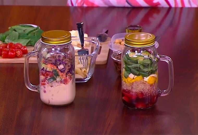 La nutricionista Sofía Araya nos enseñó a llevar las ensaladas en jarras y prepararlas en capas para que hagan varias mezclas, la lechuga llegue crujiente y, además, pueda disfrutarlas en el mismo recipiente (ver video adjunto).