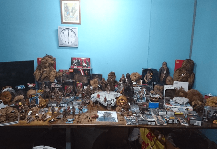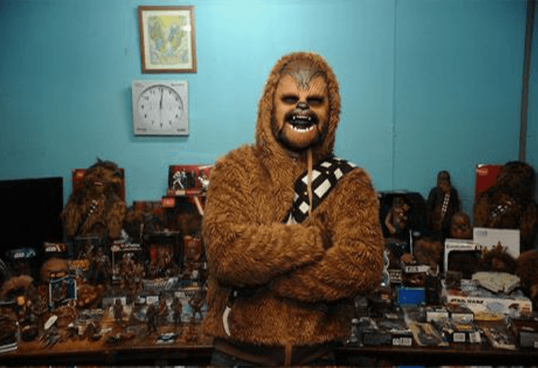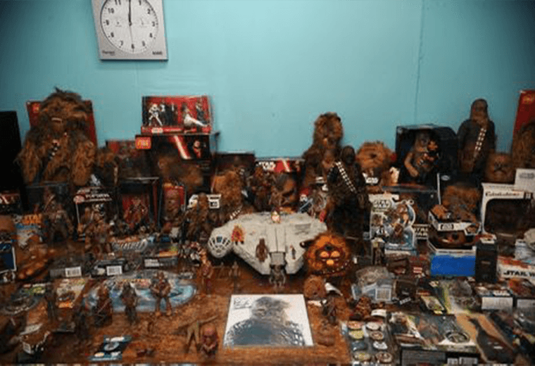 Cuenta con más de 700 piezas diferentes de Chewbacca, que es su personaje favorito de la saga. Además de otros accesorios como medias, camisetas, figuras, hasta un coffemaker o cosas más extrañas como aretes.