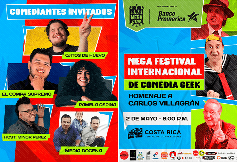 Durante el Mega Festival Internacional de Comedia Geek participarán varios comediantes invitados, entre ellos: Ojitos de Huevo, El Compa Supremo, Pamela Ospina y el grupo costarricense La Media Docena. La conducción del evento estará a cargo del comediante Minor Pérez.