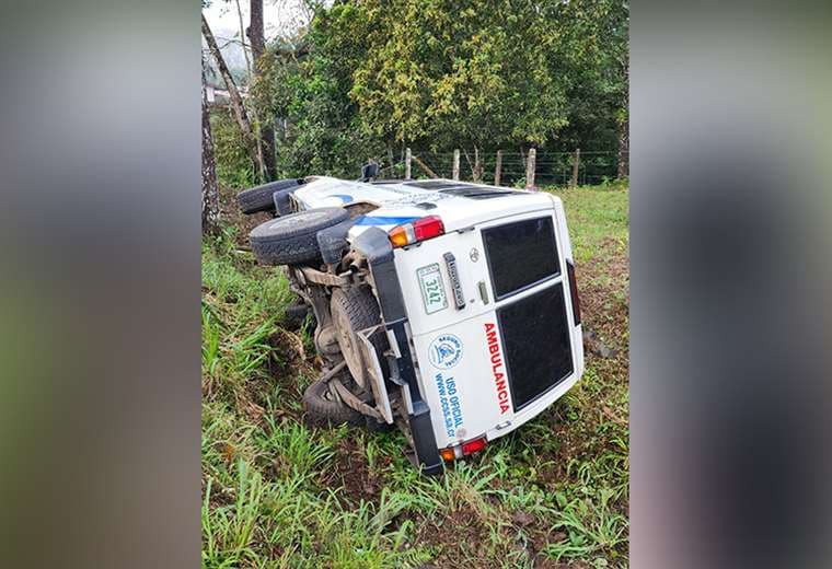 Una adulta mayor, de unos 66 años, y una mujer embarazada fueron trasladadas de emergencia al hospital luego de que la ambulancia en la que viajaban volcara aparatosamente en San Carlos, Alajuela.