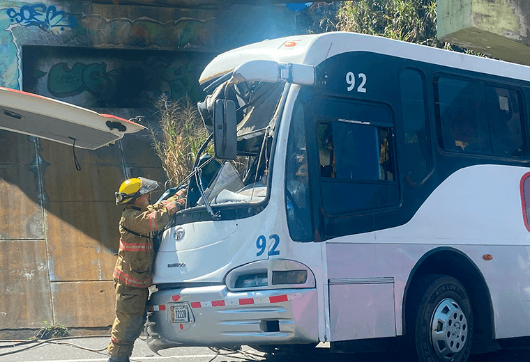 Según testigos de la escena, el chofer del autobús perdió el control del vehículo y colisionó contra la base del puente (ver galería adjunta).