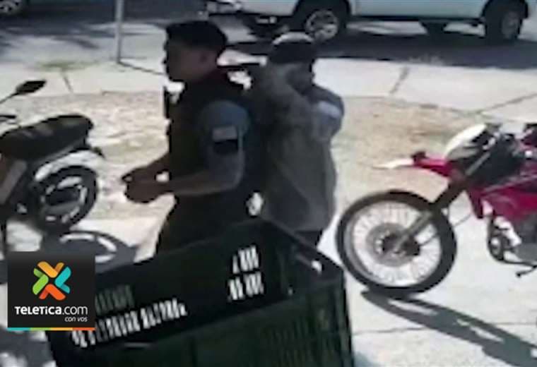 Como se observa, un hombre aborda por la espalda al oficial y lo hace caminar unos pasos hacia dentro del local.