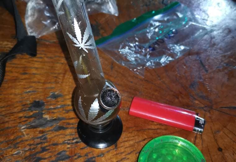 Dentro de lo decomisado se encuentran un cigarrillo de aparente marihuana, otro cigarrillo de esa misma droga a medio consumir, varios implementos para consumir drogas, así como 5 litros y una pacha de diversos licores.