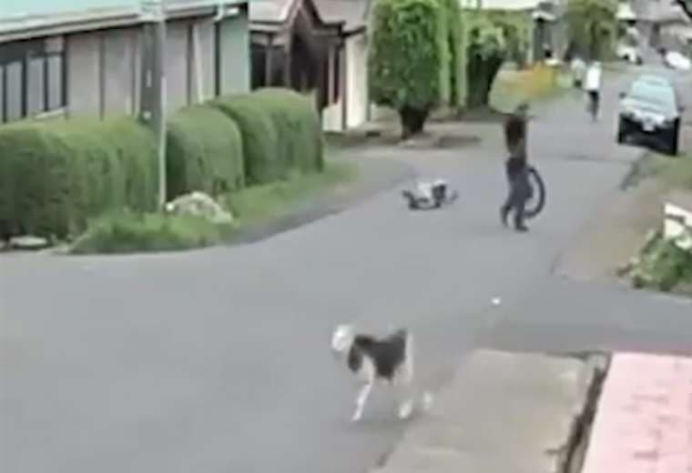 Como se aprecia en las imágenes, el atacante va sobre la calle cargando una rueda de motocicleta, mientras que al otro lado vienen tres hombres, dos caminando y un tercero en bicicleta.
