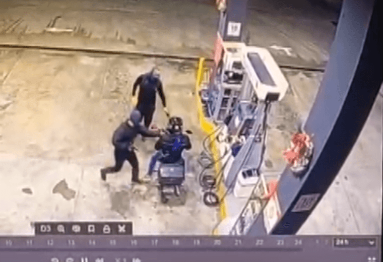 Las cámaras de seguridad del lugar muestran el momento cuando dos sujetos vestidos de negro encañonan a un cliente, lo bajan de la motocicleta y se lo llevan para la parte trasera del local donde lo acuestan boca abajo y después huyen.