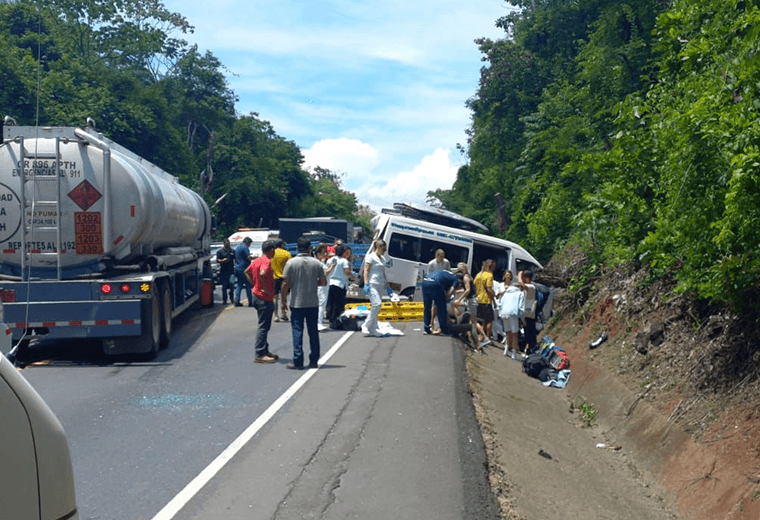 Una buseta chocó aparatosamente contra un camión cisterna y seis personas resultaron heridas en Orotina, Alajuela.