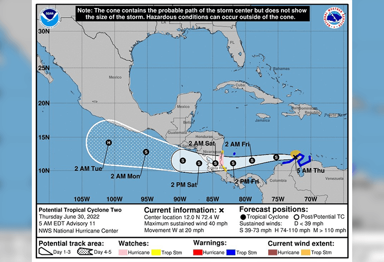 Se mantiene la trayectoria prevista de las últimas horas, ingresando a Nicaragua la noche del viernes y desplazándose cerca de la frontera entre Costa Rica y Nicaragua, con alta posibilidad que se acerque al país durante la madrugada; este sistema estará saliendo al océano Pacífico la mañana del sábado.