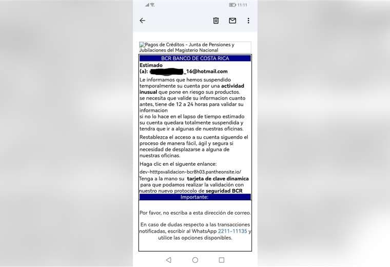 Por medio de un correo electrónico, los delincuentes están estafando a los clientes del Banco de Costa Rica (BCR).