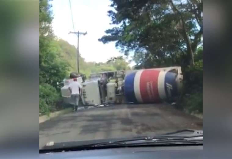 Un conductor grabó el instante cuando una chompipa cargada de cemento vuelca en Poás de Alajuela (ver video adjunto).