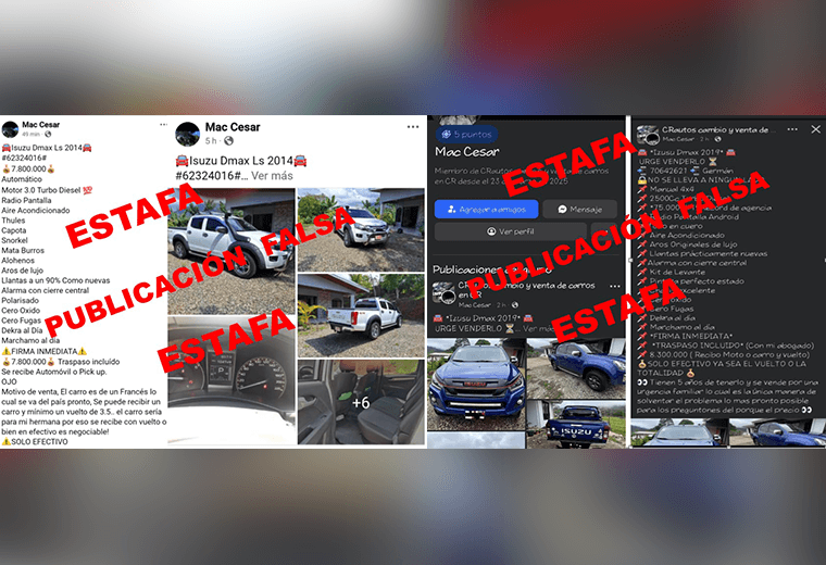 Según la sede judicial de Cartago, los delincuentes utilizan perfiles falsos para ofrecer carros tipo pick-up y automóviles por debajo del valor de mercado. Cuando las víctimas acceden a concretar la compra y asisten a la cita con dinero en efectivo —principalmente en dólares— son abordadas de forma violenta.