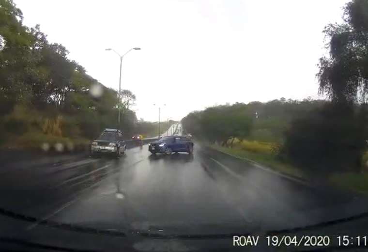 En el video se muestra cómo un vehículo liviano color azul adelanta por el lado derecho a otro, pierde el control de este, por un aparente exceso de velocidad sumado a una carreta mojada, gira hacia la izquierda e impacta otro auto que se encontraba detenido en la autopista.