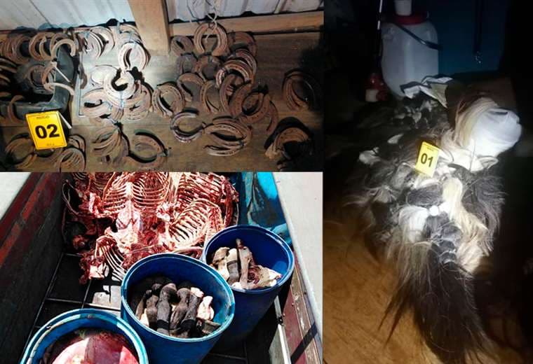 “Dos de los sospechosos viajaban en el camión y el otro fue detenido en el pick up que los custodiaba. Se les decomisó los teléfonos celulares y más de 200 crines (pelo) de caballo amarradas lo que podría hacer presumir que en dicho lugar se han sacrificado gran cantidad de equinos. También se decomisaron decenas de herraduras”, agregó la Policía Judicial.