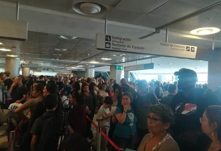 Se hacen largas filas de personas en el aeropuerto Juan Santamaría, muchas de ellas dirigidas hacia Panamá a la Jornada Mundial de la Juventud (JMJ) porque según Migración, el Poder Judicial realiza trabajos de mantenimiento en su sistema.