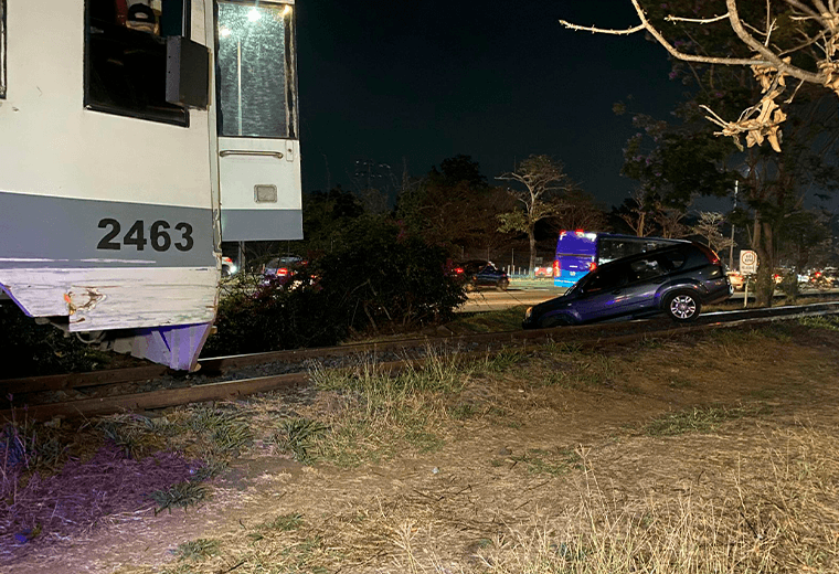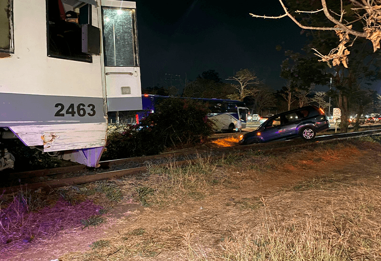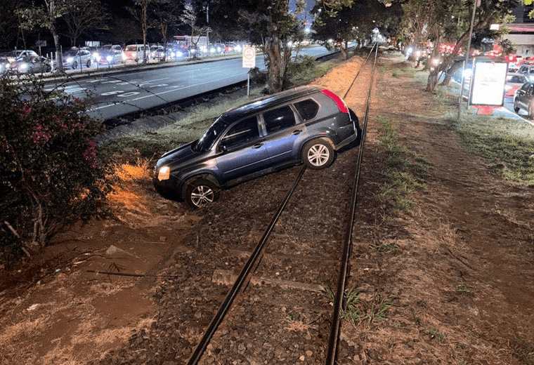 La noche de este jueves, un conductor intentó atravesar la línea del tren en Sabana Sur, aparentemente para evitar las presas que afectan la capital. Sin embargo, el carro quedó atascado, generando un nuevo contratiempo en medio de la congestión vial.