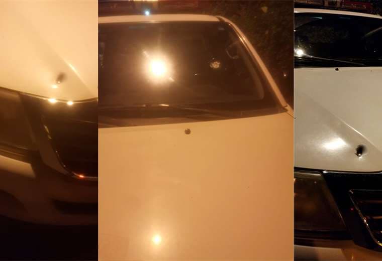 La patrulla fue impactada en el parabrisas delantero, tapa del motor, y puerta trasera derecha.