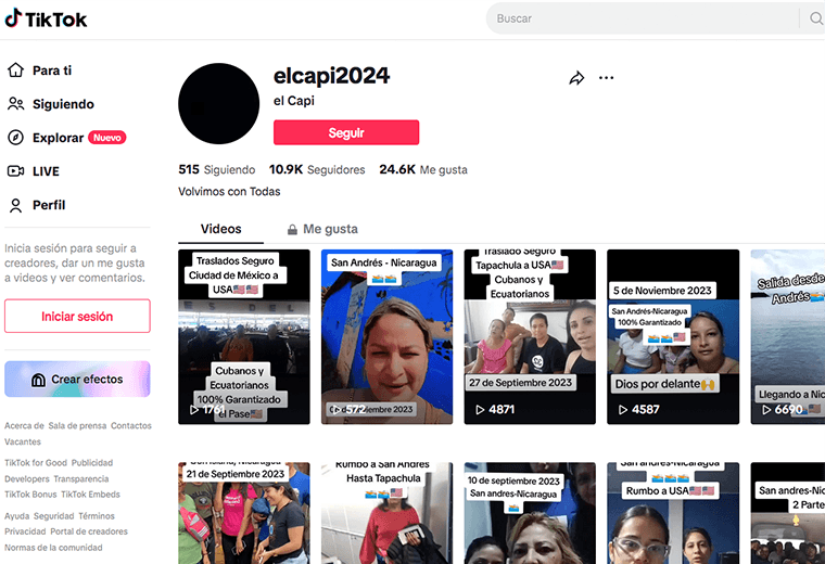 Por medio de esta red social, el "coyote" que se hace llamar “elcapi2024”, quien tiene casi 11.000 seguidores y más de 24.000 me gusta, publica videos de personas que llegaron con éxito a México, Estados Unidos, Nicaragua y Honduras.