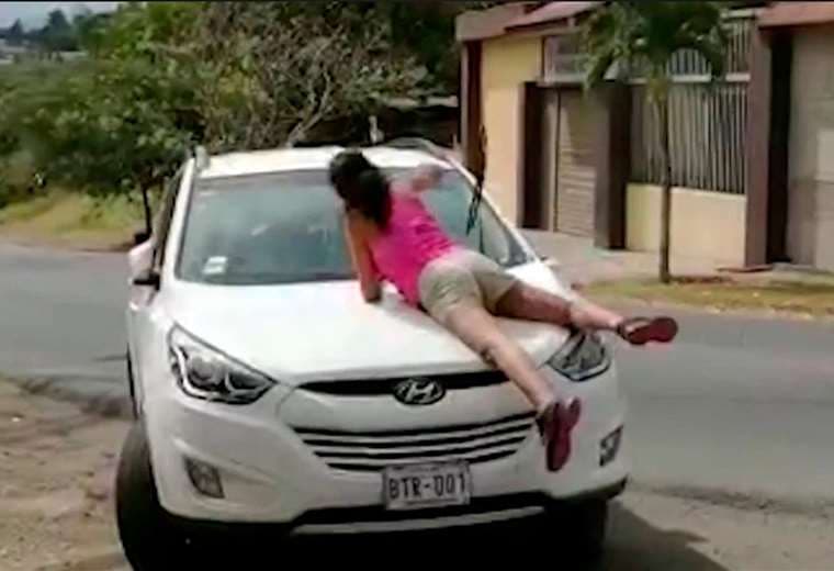 Cuando al parecer intenta destruir las escobillas del automotor, el conductor acelera el vehículo, aun llevando a la mujer en la tapa.