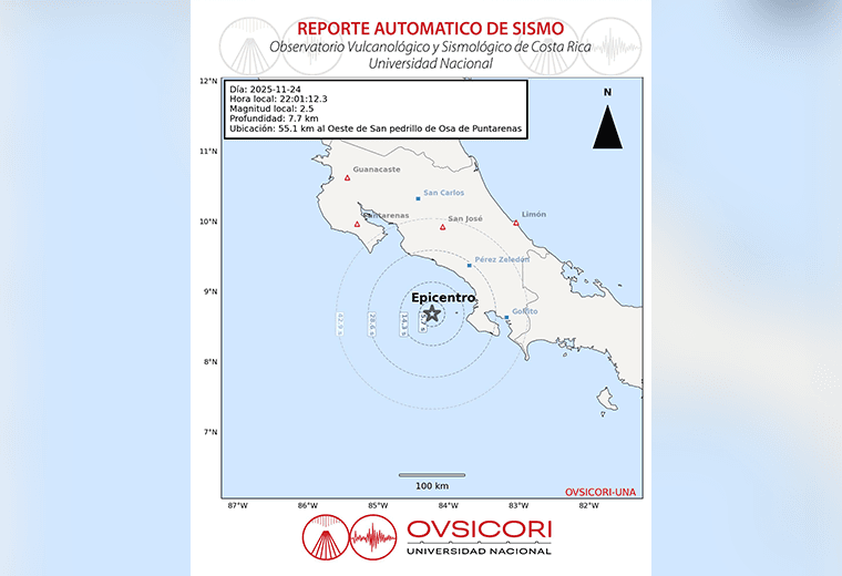 El epicentro se ubicó a 54,6 kilómetros al noroeste de San Pedrillo de Osa, Puntarenas.