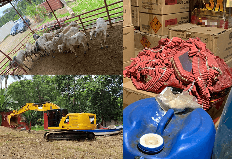Entre lo decomisado hay cuadraciclos, una moto pistera, varios tipos de pólvora, lavadoras, pantallas y maquinaria pesada (draga).