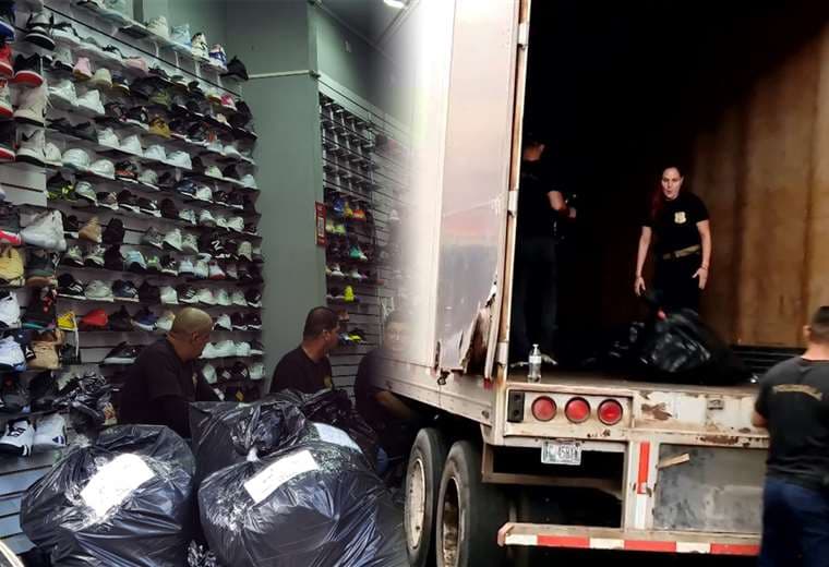 Agentes de la Policía Judicial ya llenaron dos contenedores y dos camiones, tipo tándem, con miles de tenis que fueron decomisadas luego de múltiples allanamientos realizados en San José por una aparente falsificación de marcas.