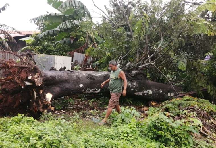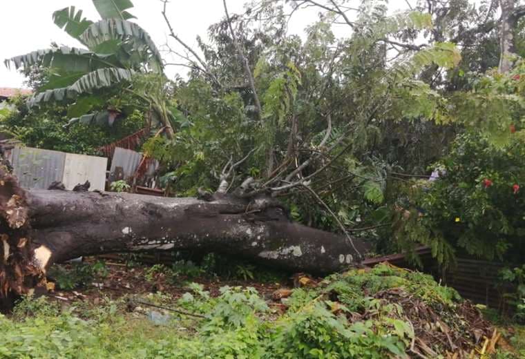 “En días anteriores ha llovido constantemente, ayer la lluvia fue más intensa, posiblemente eso socavó el terreno y provocó que el árbol cayera, tuvimos que usar cierra de cadena y equipo hidráulico, ya que las ramas eran bastante gruesas, además usamos un sistema de cuerdas para levantar las ramas”, contó a GuanaNoticias José Rodríguez, bomberos.
