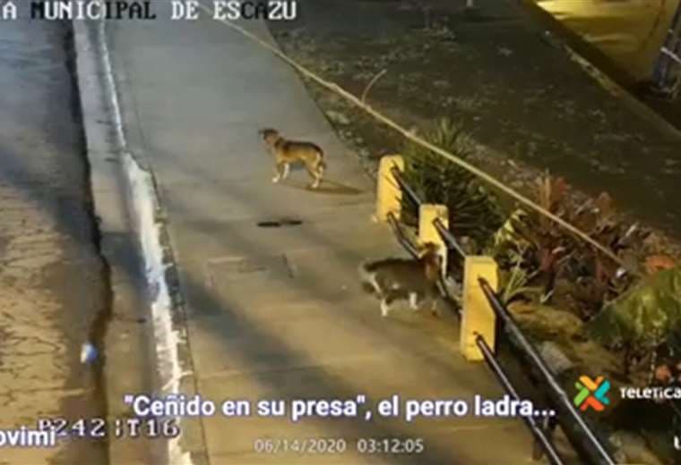 Como se aprecia en las cámaras de vigilancia y monitoreo de la Policía Municipal de Escazú, el can se pone en una actitud extraña frente al lugar, situación que hace que el oficial comience a sospechar que algo no anda bien.