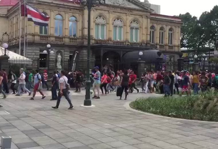Decenas de policías de Fuerza Pública atienden disturbios provocados por un numeroso grupo de personas que, pasado el mediodía, acudió al parque La Merced para protestar por la presencia de nicaragüenses en ese sitio.