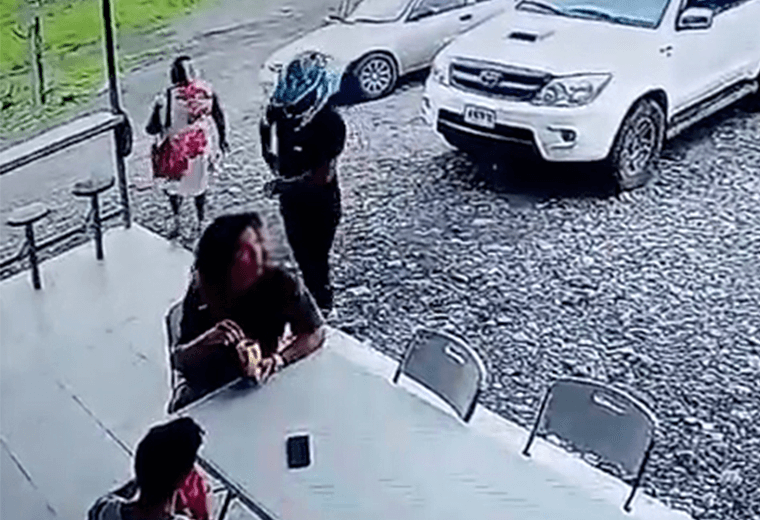 Como se aprecia en el video adjunto de una cámara de seguridad, dos sujetos llegaron en una motocicleta, uno de ellos se bajó sin quitarse el casco y rodeó por detrás a la víctima.