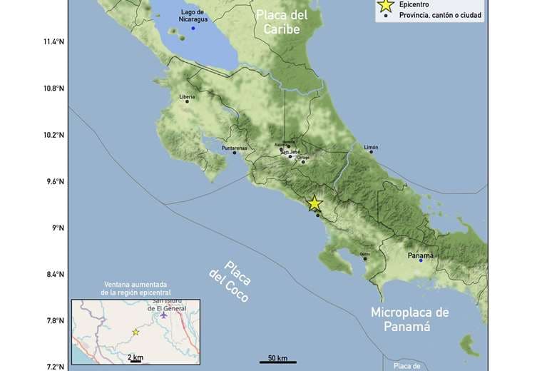 La profundidad fue de cinco kilómetros y el epicentro se localizó 800 metros al noreste de Alfombra de Pérez Zeledón.