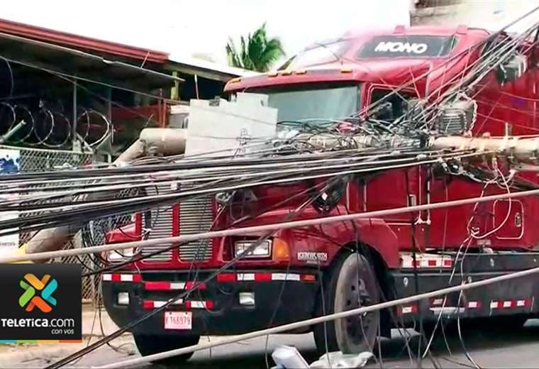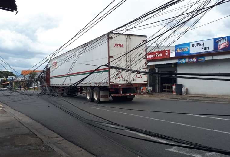 Al parecer, el tráiler se enganchó en los cables, los arrastró y provocó que cuatro postes se quebraran. Una de estas estructuras cayó sobre la cabina del camión.