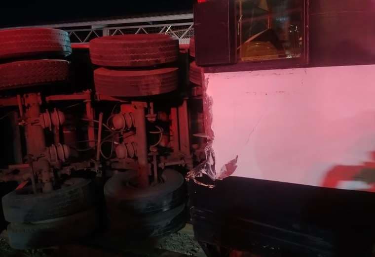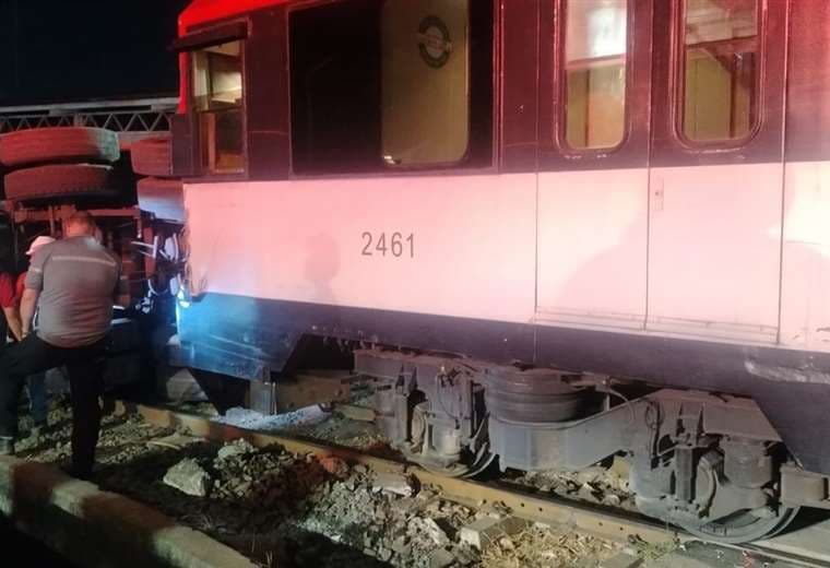 Producto del impacto, la carreta del vehículo pesado quedó completamente volcada. Afortunadamente, tanto el conductor del tráiler como los pasajeros que viajaban en el tren resultaron ilesos.