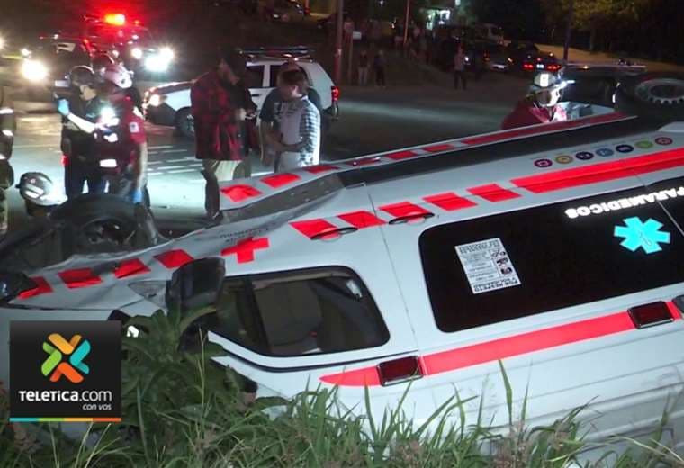 La unidad de la Cruz Roja volcó tras colisionar con un vehículo en el cruce de Brasil de Mora, en ruta hacia Villa Colón, pasadas las 8 p. m. del domingo.