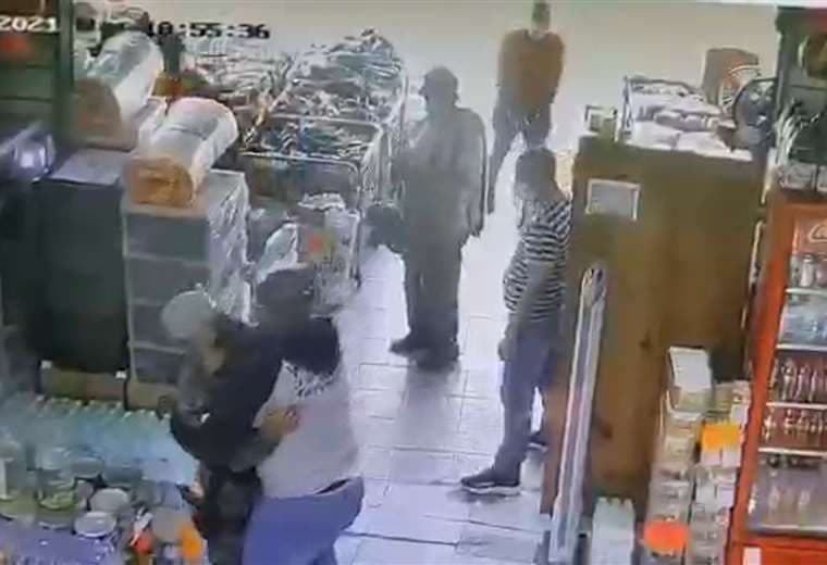 Como se aprecia en el video adjunto, uno de los sujetos ingresa primero al local haciéndose pasar por cliente, mientras que otro hombre aprovecha que el oficial está hablando con dos hombres para atacarlo.